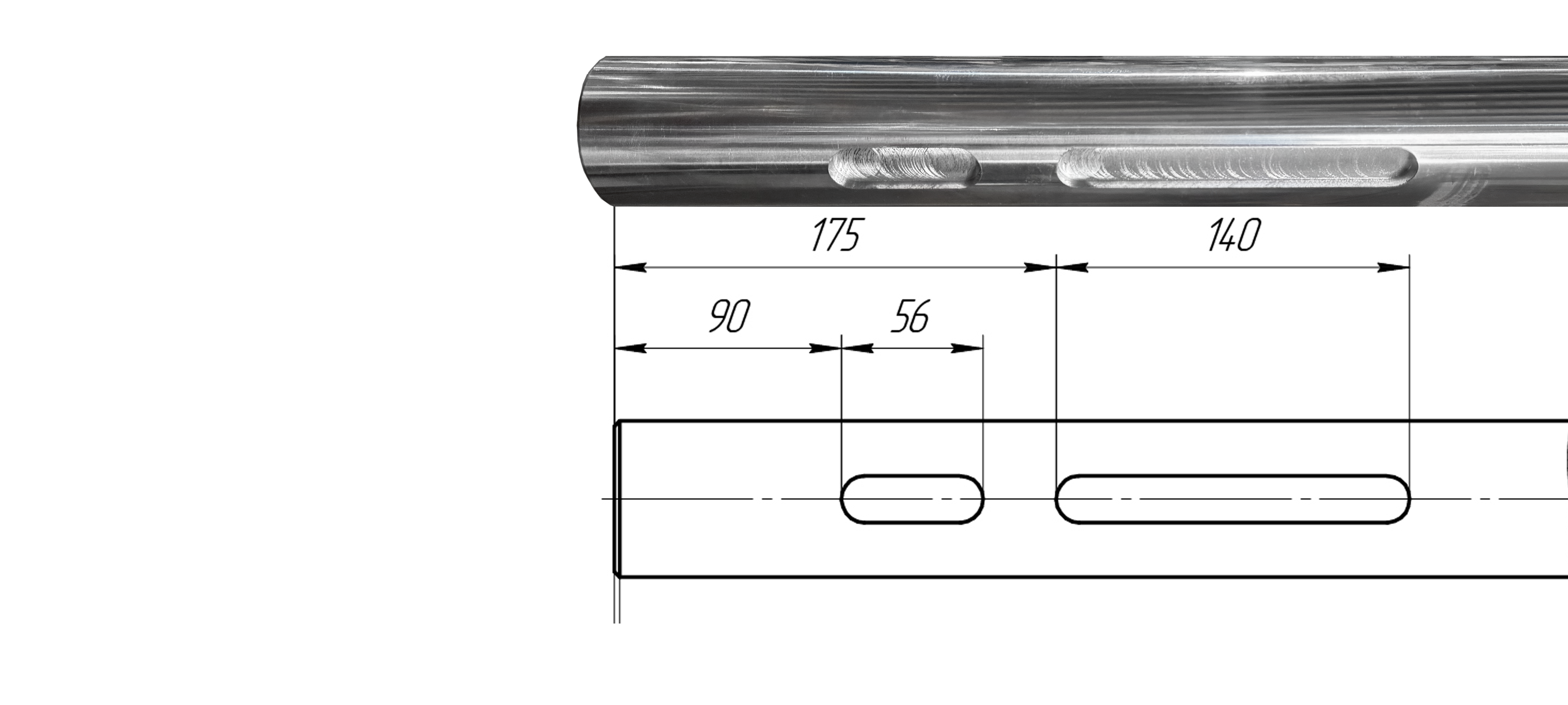 Вал был установлен на станок с применением люнетов без этого при такой длине детали обеспечить необходимую жёсткость системы невозможно. Фаски снимались с обоих торцов с соблюдением угла 45° и симметричности относительно оси. Фрезерование шпоночных пазов выполнялось с контролем размеров на каждом проходе: постепенное снятие металла с промежуточными замерами - единственный способ гарантировать точность на детали, где перебор невозможно исправить.